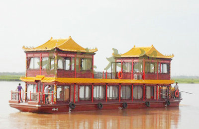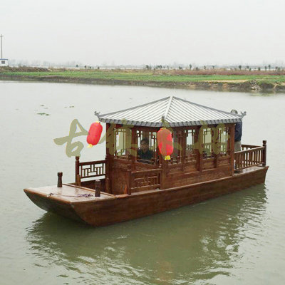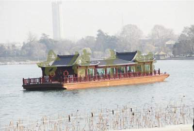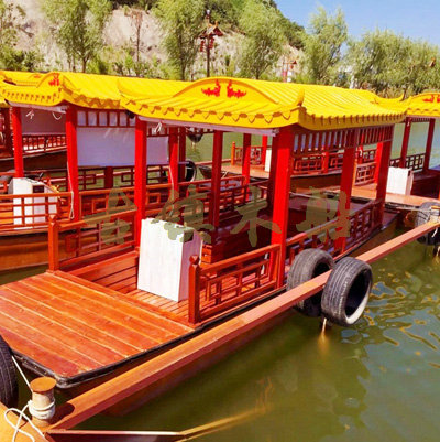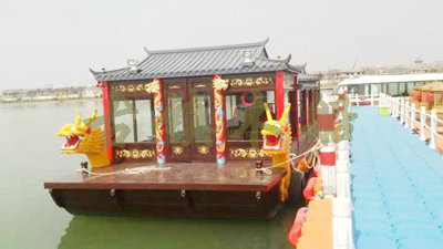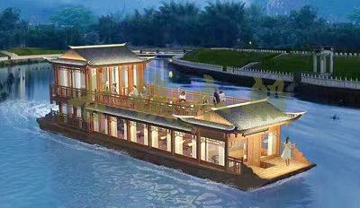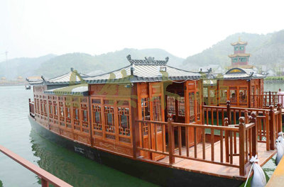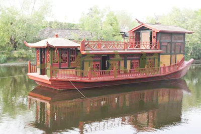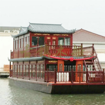 畫舫船就是裝飾古典華麗的游船,是"中國風"的仿古游船,結(jié)合古典園林建筑,體現(xiàn)了中華文明的古典藝術(shù).畫舫船豪華而又古典,船上的建筑按照中國古代建筑里的亭臺樓閣,建筑工藝之復(fù)雜,要求之嚴格,仿古畫舫游船的特點飛檐翹角、玲瓏精致的四角亭子逐漸成形,赫然立于船頭,美人靠、盤龍柱子、彩畫……龍柱上的浮雕盤龍和祥云一層扣著一層,層層錯落有致,雕刻精細到盤龍身上的每一個鱗片都細細可數(shù),古代皇家標志性元素,在畫舫船上體現(xiàn)的淋漓盡致。除了雕刻、花窗,整條船還有一個看點,那就是弧線優(yōu)美、高高翹起的船尾。游船并不大,長約10米、寬3米,但是整體看起來堪稱一件藝術(shù)品。船尾的雕花欄桿與船艙、船頭的雕刻遙相呼應(yīng),船身四周貼著浮雕祥云,給整條船增添了富貴、華麗的氣質(zhì)。